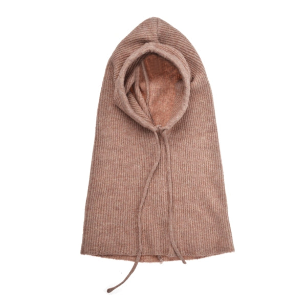 balaclava, bruin, 30X56cm. 6% wol 20% spandex 30% acryl 44% polyester. 115gram. Muts en colsjaal tegelijk.