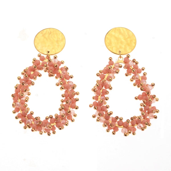 Oorbel met steker. Goudkleurig, stainless steel. Hanger is druppel met kristallen en stainless steel goud kraaltjes. Totale lengte 6 cm.
