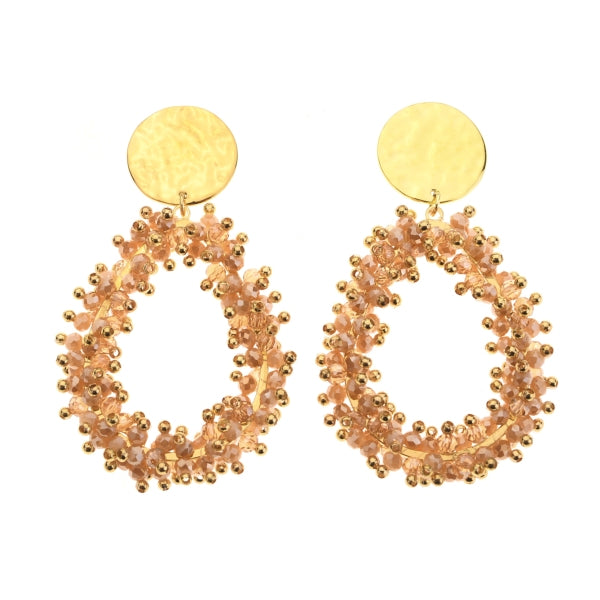 Oorbel met steker. Goudkleurig, stainless steel. Hanger is druppel met kristallen en stainless steel goud kraaltjes. Totale lengte 6 cm.