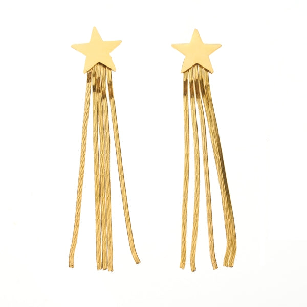 Luxe statement oorbellen in stervorm met elegante goudkleurige kettingfranjes. Gemaakt van roestvrij staal – stijlvol, speels en perfect voor een glamoureuze look. Totale lengte 10cm.