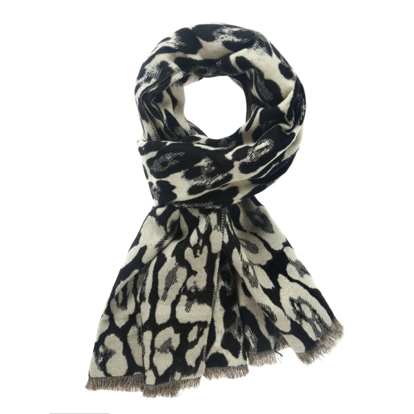 sjaal jaguar print, offwhite, 65x180cm, 100% polyester, 300g. Kleine wimper franjes.