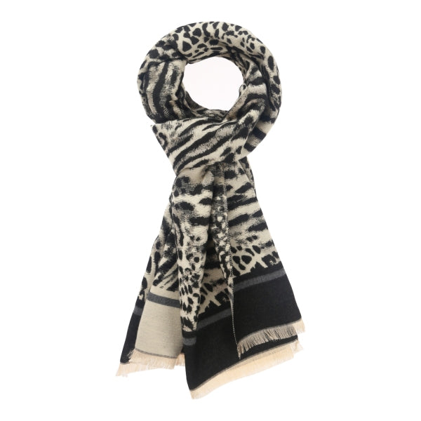sjaal panter print, offwhite, 65x180cm, 100% polyester, 300g. Kleine wimper franjes.