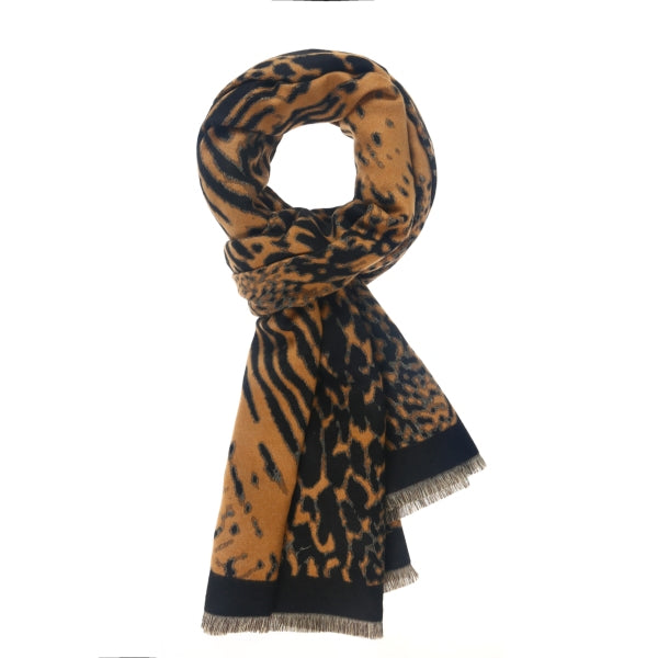 sjaal tijger print, bruin, 65x180cm, 100% polyester, 300g. Kleine wimper franjes.