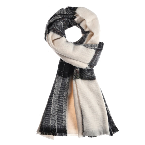 sjaal, grote ruit, zwart en offwhite, 65x190cm, 100% polyester, 250g Kleine wimper franjes.
