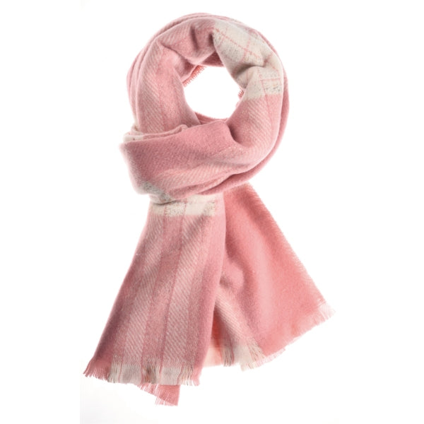 sjaal, grote ruit, pink roze met offwhite, 65x190cm, 100% polyester, 250g Kleine wimper franjes.