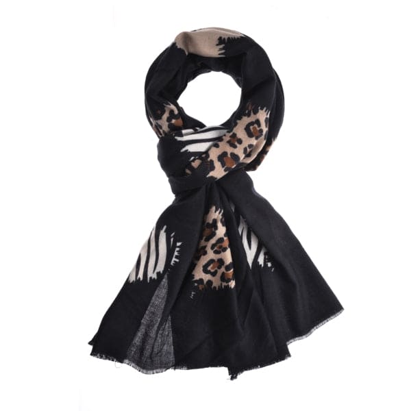 Dunnere sjaal met hartjes in dierenprint, zwart met bruin en beige . 90x180cm, 100% polyester, 190g