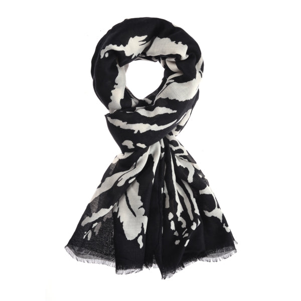 dunnere sjaal, leopard print, zwart met wit, 90x180cm, 100% polyester, 150g. Kleine wimper franjes.