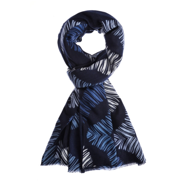 dunnere sjaal, sjaal grafische print van zebra, blauw met wit en lichtblauw. 90x180cm, 100% polyester, 190g . Kleine wimper franjes.