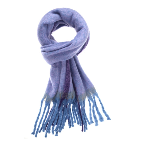 Dikke zachte sjaal met aan zijkanten strepen. Paars met blauw en bruin. 42x180cm, 100% polyester, 290g. Lange gedraaide franjes van 18cm.