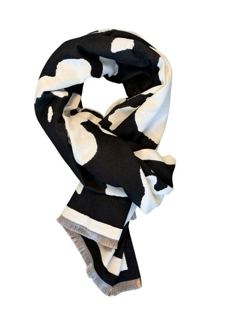 Deze stijlvolle sjaal combineert een koeien zwart-wit print met een soepele, zachte kwaliteit. Dankzij het royale formaat is hij zowel als sjaal, stola als omslagdoek te dragen – ideaal voor modische combinaties in iedere collectie. De subtiele wimperfranjes aan de uiteinden geven een speelse, luxe afwerking.
